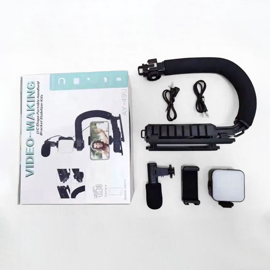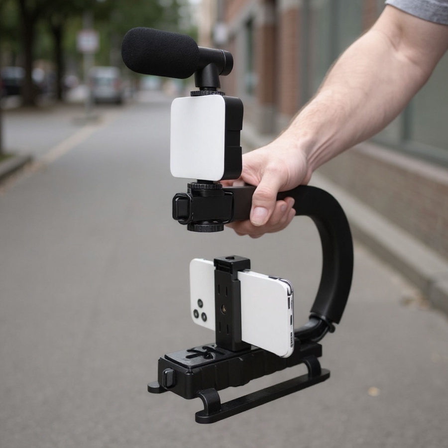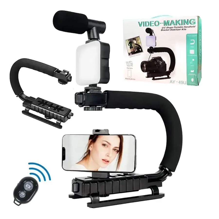 تصميم عملي وخفيف يجمع بين الإضاءة، الميكروفون، والحامل الثلاثي في طقم واحد جاهز للاستخدام.