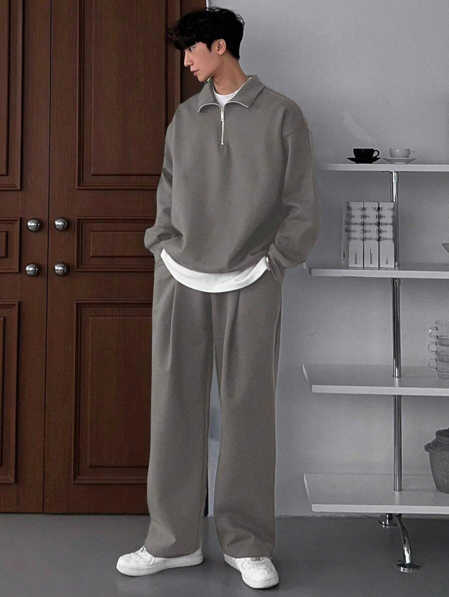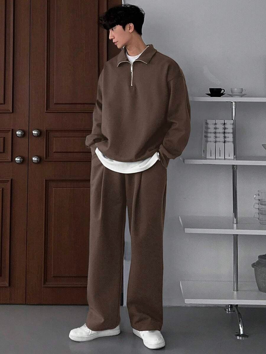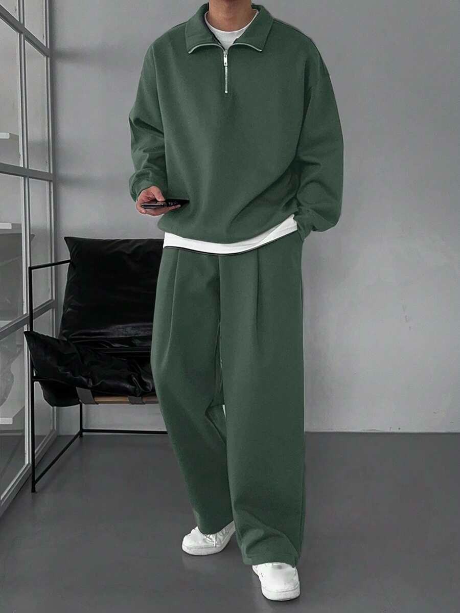 يتكون الطقم من بلوزة بسحاب ربع تمنح سهولة في الارتداء وتضيف لمسة عملية للتصميم، مع بنطلون مريح مزود بجيوب لحمل الأغراض الأساسية. اللون السادة يمنح الطقم مظهراً مرتباً ويسهل تنسيقه مع مختلف الأحذية والإكسسوارات.